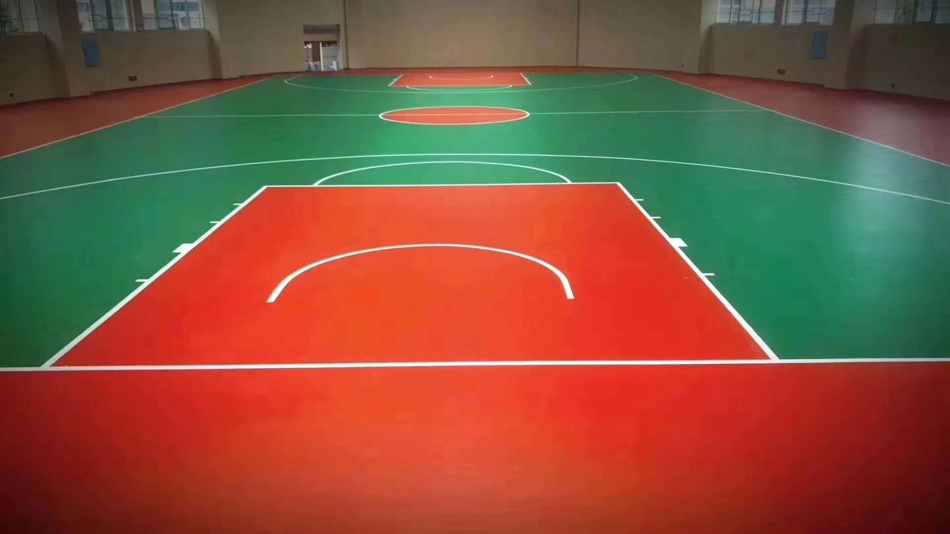 (4)填充层:用水性塑胶底料兑水掺石英砂(60~80目)充分搅拌后在弹性层上刮涂一遍,使地面更加均匀,密实,增加球场强度。
